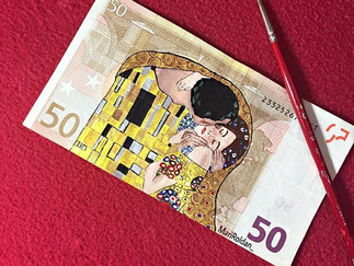 Mari Roldán is a young Andalusian artist who had the great idea of using current banknotes and coins as supports for her works. Using mainly acrylic paints Mari reproduces, in a miniaturized version, great masterpieces of art, works by Van Gogh, Klimt, Picasso, Magritte, and also modern works by Bansky or Andy Warhol; generally on a single banknote, in some cases on several bills that must be aligned to get the whole picture.