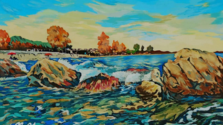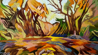 Nel suo lavoro è molto facile individuare il mix di uno spettro completo di colori, che può rappresentare molte emozioni diverse. Personalmente ho avuto un senso molto calmante e un'ondata di positività dai colori pastello mescolati con i morbidi toni della terra. I tronchi dei suoi alberi della strada laterale sono tinti con un mix di blu e marrone, metà autunno e metà primavera, la cresta gialla su di essa, ha accenni di verde, e malva, e l'iper colore della pavimentazione sembra quasi psichedelico. Per un breve momento mi è sembrato di camminare in quella stessa strada in una notte di pioggia.