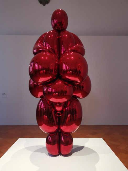 ...e poi arriva lui, Balloon Dog, in acciaio inossidabile lucidato a specchio con verniciatura rossa trasparente, e scintillante come il resto delle opere. Questo cagnolino di oltre tre metri illude e ti da l'impressione di essere leggero, persino fragile, che possa scoppiare da un momento all'altro se qualche ospite della mostra ci prende contro; ma non è ne leggero ne fragile, e riflette tutto ciò che passa sulle sue sinuose forme. Sempre per il concetto dell'apparenza. Per realizzarlo Koons si è rivolto a una fonderia specializzata perché voleva riprodurre fedelmente le strette torsioni e le curve di un palloncino gonfiato da un clown a una festa. Incredibile è il contrasto tra esterno cosí liscio e levigato perfettamente e l'interno vuoto.
